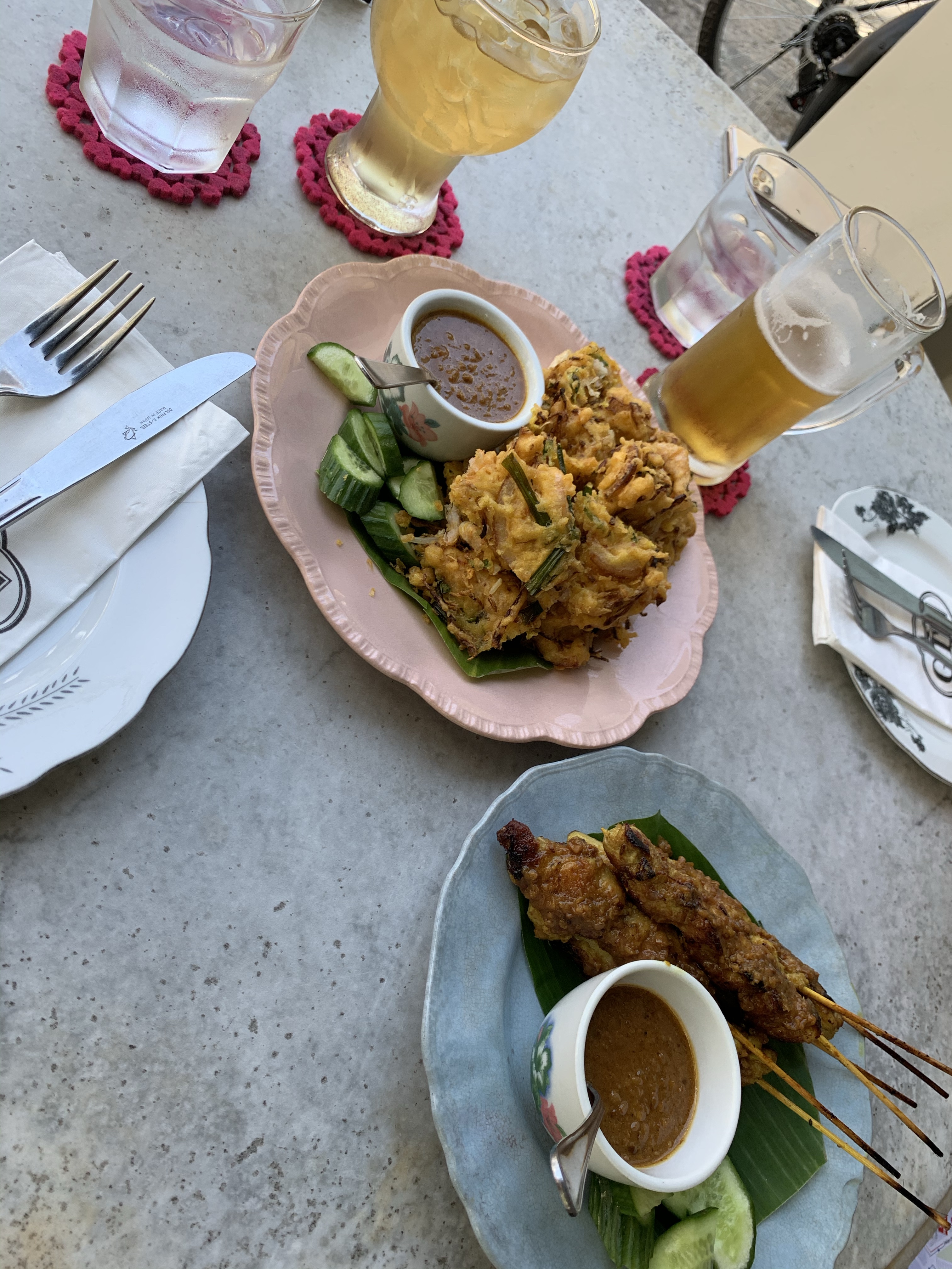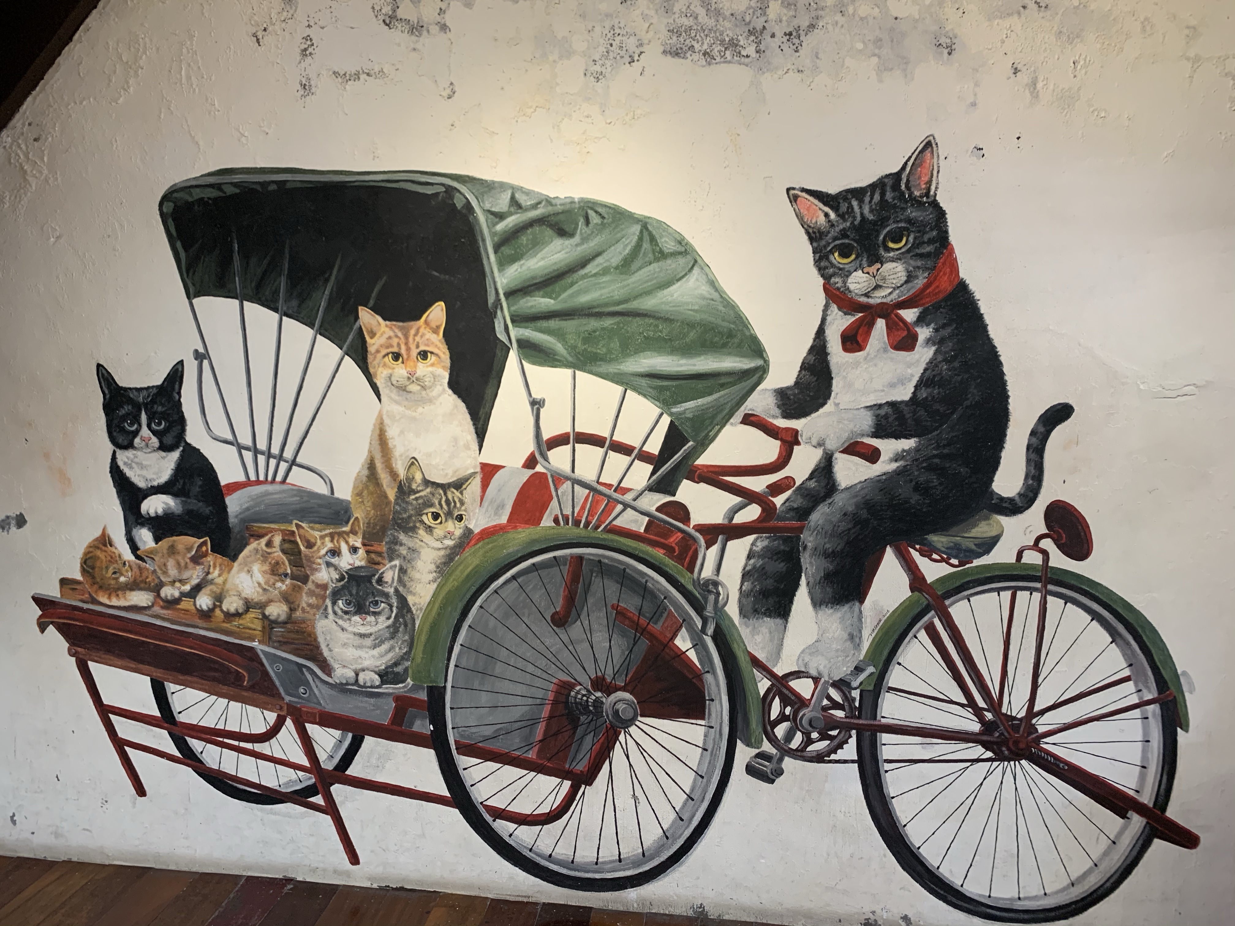 It was time to stop for lunch, and since Auntie loves cats, we picked the Mews Cafe, which is also associated with the hotel group Seven Terraces is a part of. A bit “pricey” but delicious, we munched on satay and fried patties filled with prawns and veggies. I watched backpackers file in and out of a hostel across the street and young people grab rides to their destinations (can’t handle the heat I guess!).